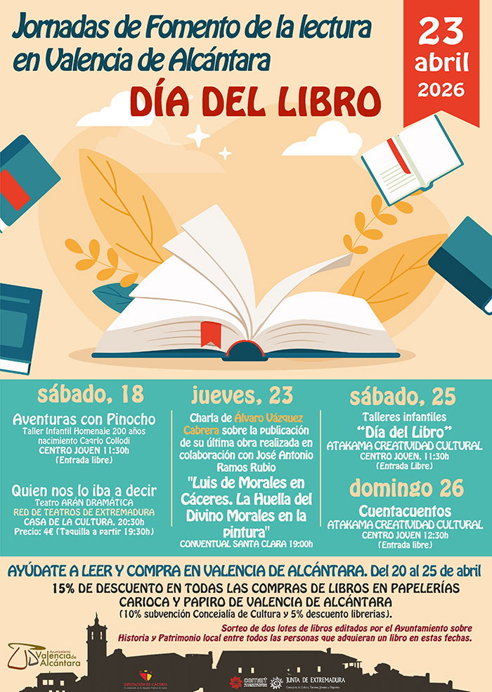 El Ayuntamiento de Valencia de Alcántara, ha organizado del 18 al 26 de abril las Jornadas de Fomento de la Lectura “Día del Libro” 2026, con una programación pensada para todos los públicos y con actividades culturales, infantiles, teatrales y de animación a la lectura.