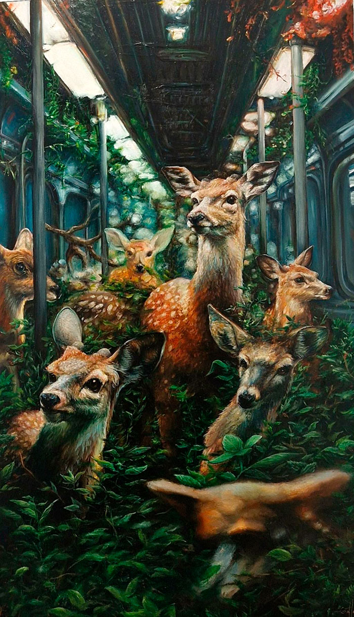 El ganador de esta edición, Irolando Gattorno (Santa Clara, Villa Clara, Cuba, 1997) Comienza su trayectoria como retratista y pintor naturalista, muy marcado por la academia, desde mediados de 2022 ha absorbido las nuevas corrientes contemporáneas y la línea discursiva dentro de la figuración. En "La noticia", Gattorno construye una escena alegórica y profundamente crítica de la sociedad contemporánea, utilizando como protagonistas a un grupo de venados dentro de un vagón de metro. La elección de estos animales —símbolos de vulnerabilidad, alerta y gracia— colocados en un entorno urbano artificial e inhóspito, genera un potente contraste visual y conceptual. Cada venado responde de manera distinta ante un suceso no revelado, pero claramente disruptivo: algunos se muestran atónitos, otros aterrados, y unos pocos permanecen indiferentes. Esta gama de reacciones encarna la diversidad de respuestas humanas frente a las noticias que impactan el tejido social: desde la empatía hasta el desapego, desde el miedo hasta la negación. El uso del óleo sobre una tabla curva acentúa la sensación de encierro y distorsión, recordándonos cómo los medios y las estructuras sociales pueden moldear y doblar nuestra percepción de la realidad. Como es característico en su obra, Gattorno no ofrece respuestas, sino que pone en evidencia las tensiones, contradicciones y comportamientos que definen nuestra época. "La noticia" no ilustra un hecho específico: lo que importa no es el contenido de la noticia, sino su efecto sobre quienes la reciben. En este teatro de lo cotidiano, el artista nos invita a mirarnos a través de estos animales antropomórficos, cuestionando nuestras propias formas de reaccionar, resistir o ignorar.