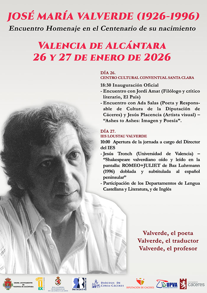 El próximo 26 de enero se cumplirán cien años del nacimiento del poeta, filósofo, traductor y profesor universitario, José María Valverde. Por ello, el Ayuntamiento de Valencia de Alcántara, pueblo que lo vio nacer, ha organizado, junto a otras entidades públicas y privadas, un conjunto de actos para conmemorar el centenario de quien fuera una de las mayores y más reconocidas figuras intelectuales de la segunda mitad del siglo XX en España.