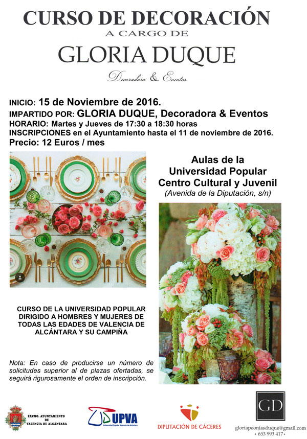 Gloria Duque Decoradora & Eventos en colaboración con la Universidad Popular de Valencia de Alcántara ha organizado un Curso de Decoración dirigido a hombres y mujeres de todas las edades de Valencia de Alcántara que tendrá lugar en el Centro Cultural y Juvenil durante el periodo noviembre 2016 - mayo 2017.