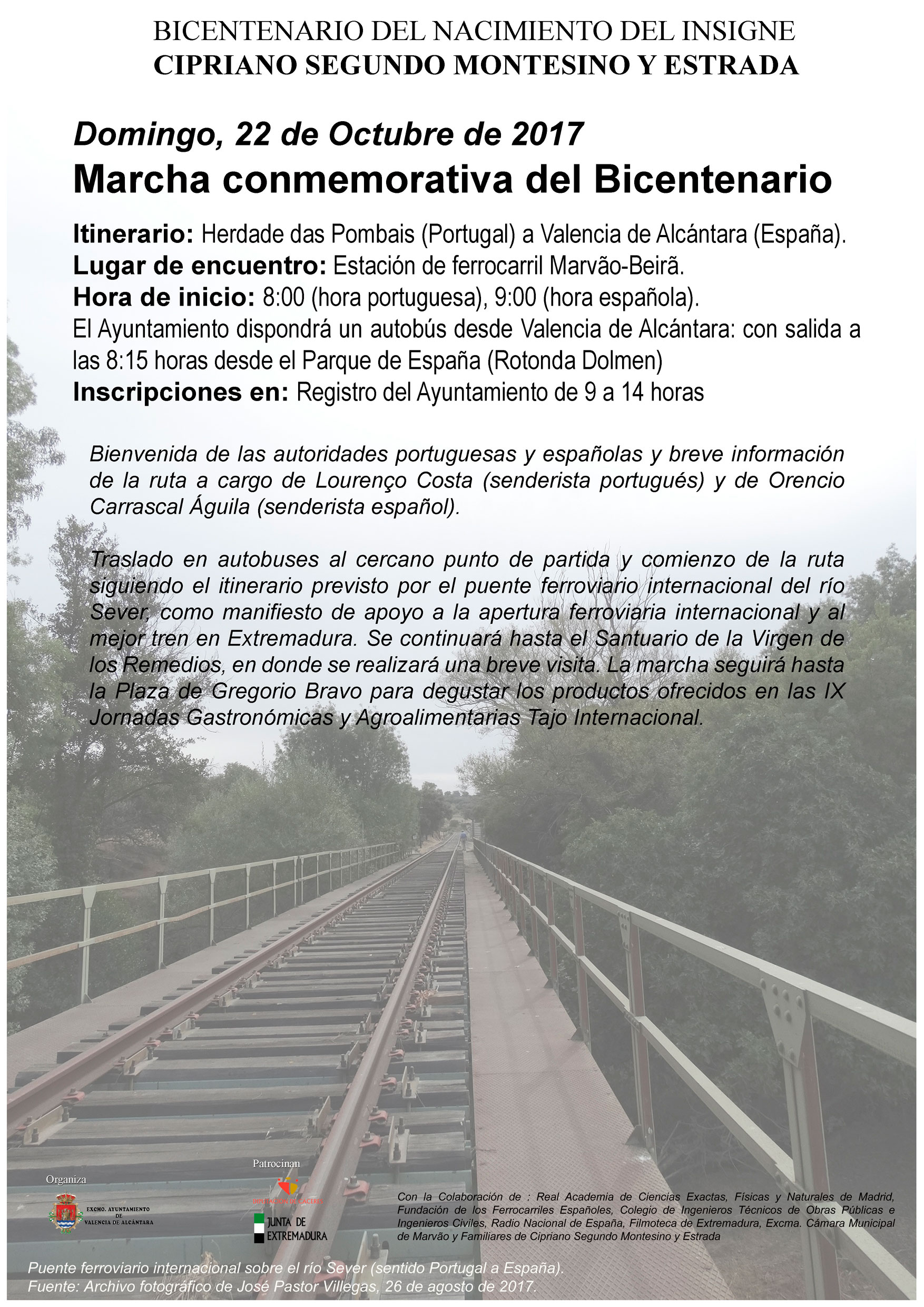 Aunque ayer, día 26 de septiembre, fue la fecha del bicentenario los actos comenzarán el 22 de octubre con una marcha conmemorativa entre Herdade das Pombais (Portugal) y Valencia de Alcántara. A este respecto, Alberto Piris ha señalado que Valencia de Alcántara "siempre mira a Portugal", con lo que se ha querido incluir al país vecino en la celebración de este evento. Los días 3 y 4 de noviembre tendrán lugar ponencias y mesas redondas en torno al ferrocarril, que servirán además para reivindicar un tren digno para la región. Asimismo, hasta junio del próximo año hay programadas varias actividades como una exposición, descubrimiento de una placa en la Plaza de la Constitución y un viaje en tren a Madrid para visitar el Museo del Ferrocarril, entre otros espacios.