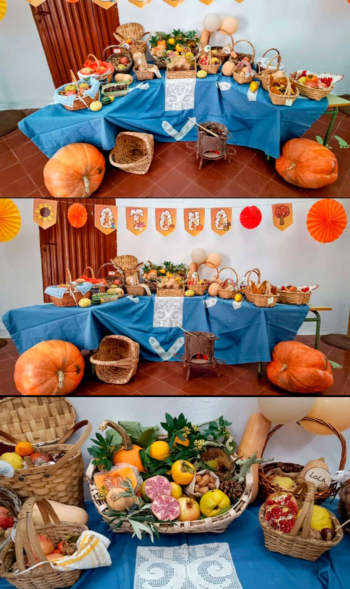 Muestra expositiva de castañas, frutos variados del otoño, y frutas de temporada