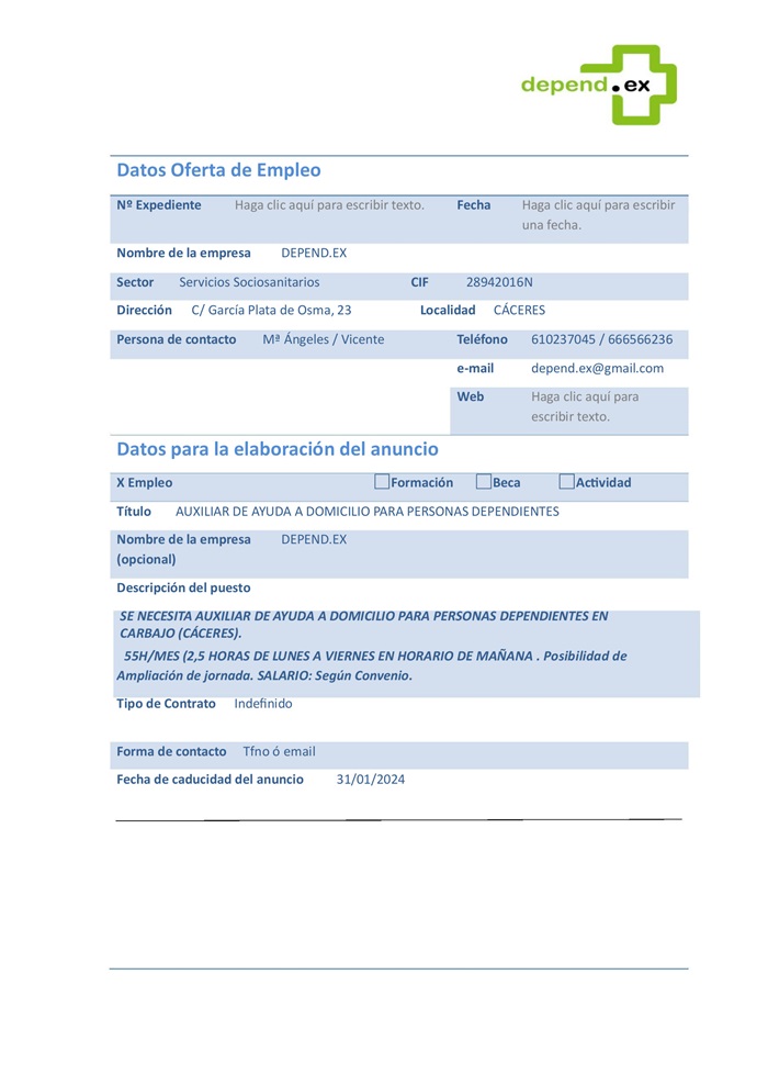 Oferta de Empleo del Grupo DEPEND.EX para Carbajo: AUXILIAR DE AYUDA A DOMICILIO PARA PERSONAS DEPENDIENTES
