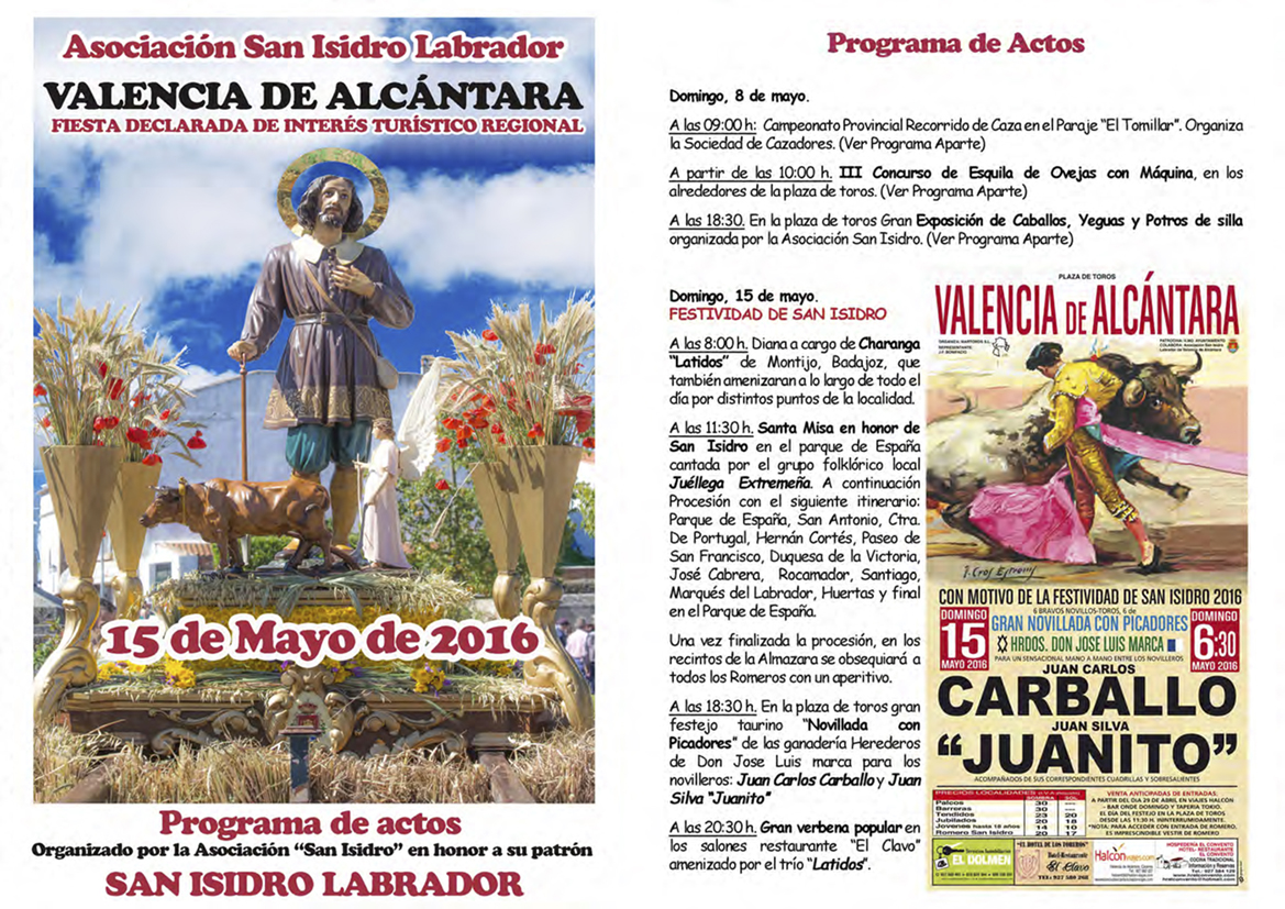 En Colaboración con el Ayuntamiento de Valencia de Alcántara, con la Diputación de Cáceres y Consejería de Turismo del Gobierno de Extremadura la Asociación de San Isidro presenta este año un programa cargado de actividades en honor a su patrón San Isidro Labrador.