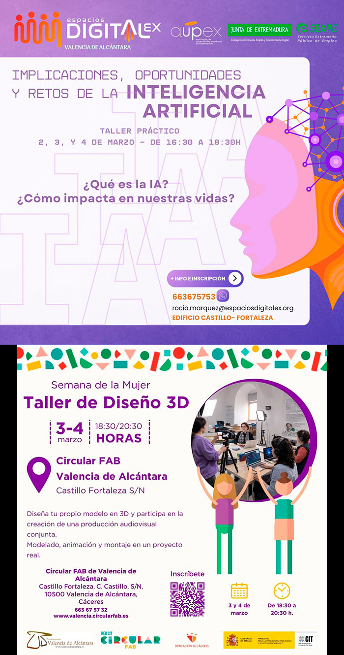 El espacio digital de Valencia de Alcántara organiza para los días 2, 3 y 4 de marzo el Taller: Implicaciones, oportunidades y retos de la Inteligencia Artificial.