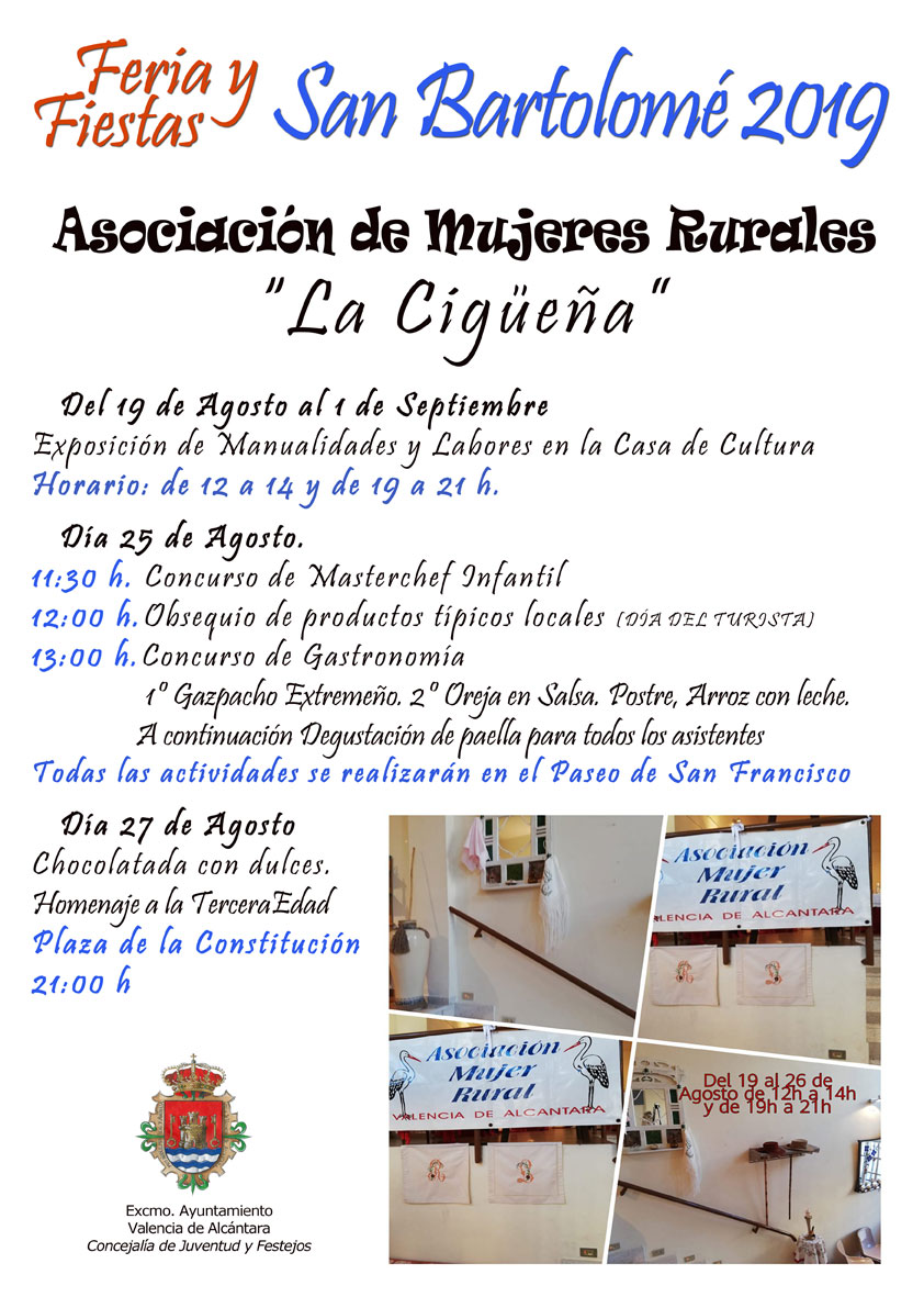 13:00 Concurso de gastronomía. 1º gazpacho extremeño. 2º orejas en salsa. Postre, arroz con leche. A continuación degustación de Paella. Paseo de san Francisco. Asociación Mujeres Rurales La Cigüeña.